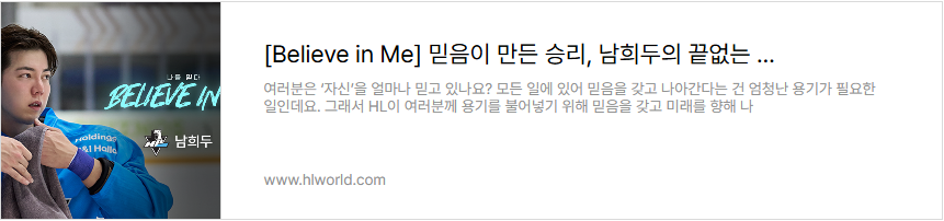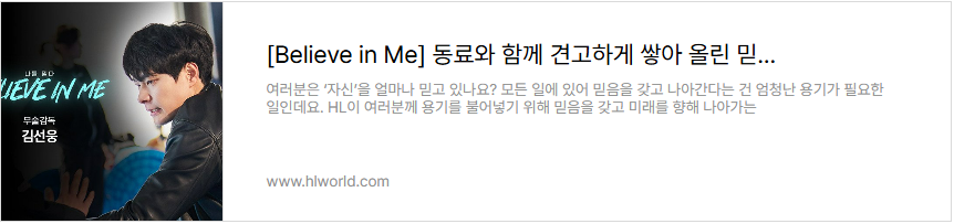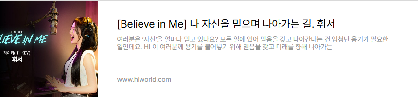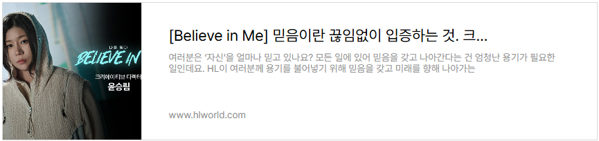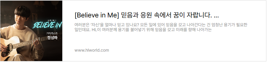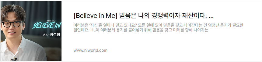 HL은 지난 2년간 ‘믿음’의 가치를 전하며, 우리 주변의 ‘에이첼’들을 찾아 나섰습니다. 먼저 스스로를 믿고 자신의 미래를 향해 나아가는 이들의 이야기를 담은 시리즈, [Believe in Me]에서는 HL안양의 남희두부터 하이키 휘서까지, 각자의 자리에서 ‘믿음’을 증명한 7인의 이야기가 공개되었습니다. 각기 다른 분야에서 자신만의 방식으로 ‘믿음’을 보여준 이들의 이야기를 아래 링크에서 다시 만나 보세요.