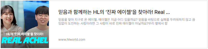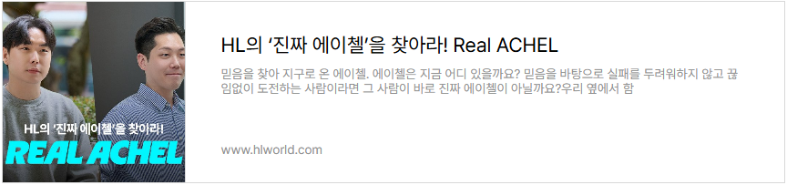[Believe in Me]가 HL 바깥의 ‘에이첼’을 만나는 이야기라면, [Real Achel]은 HL 안에서 믿음을 실천하는 진짜 ‘에이첼’들의 순간을 포착했습니다. 임직원이 직접 추천하고 선정한 ‘리얼 에이첼’ 4인의 이야기를 아래에서 확인해 보세요.